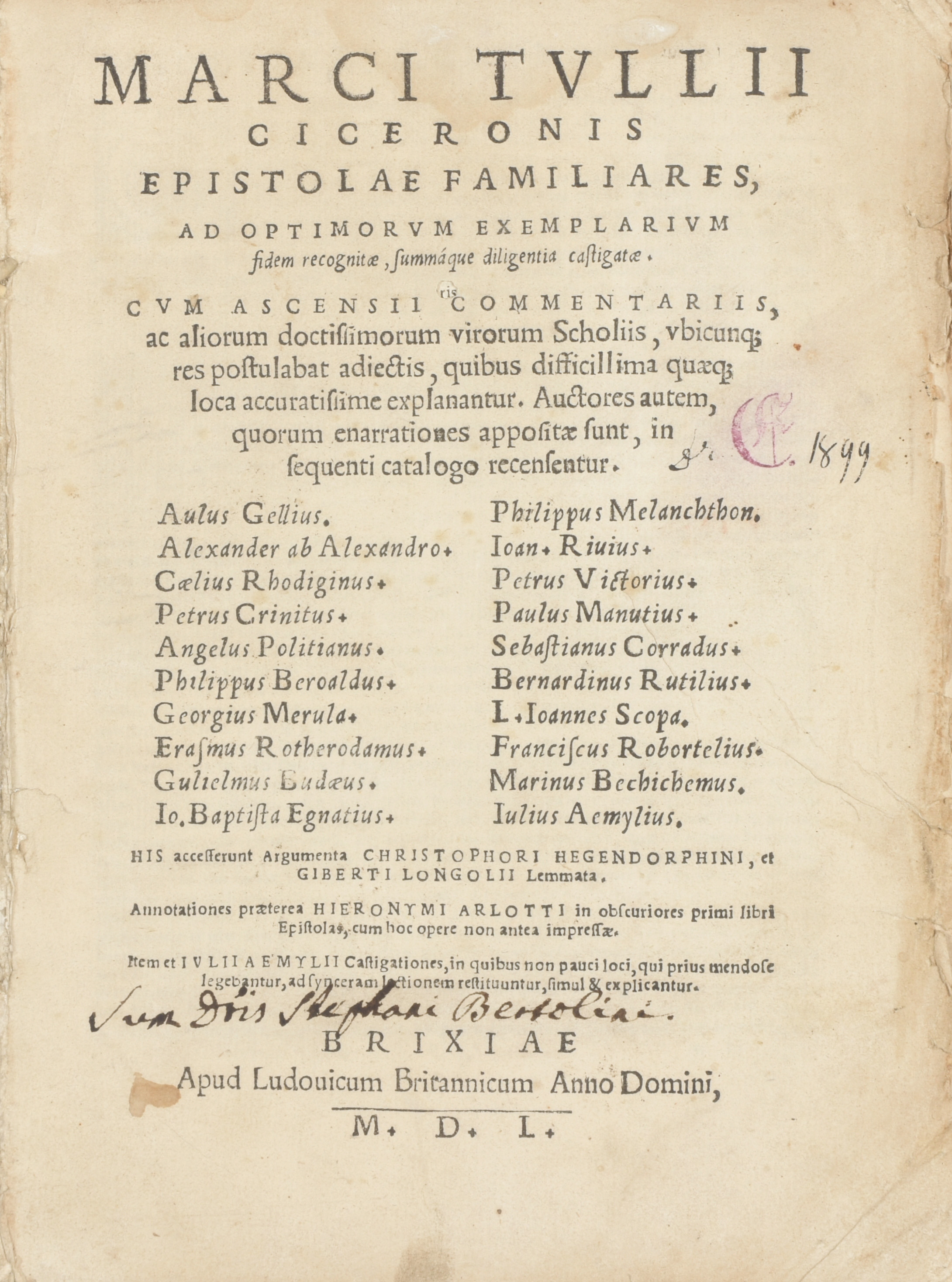 Epistolae familiares [...] cum Ascensii Commentariis, ac aliorum doctissimorum virorum Scholiis [...] Angelus Politianus [...] ERASMUS Rotherodamus, Gulielmus Budaeus [...] Philippus Melanchthon [...] Paulus Manutius [...]. His accesserunt Argumenta Chris